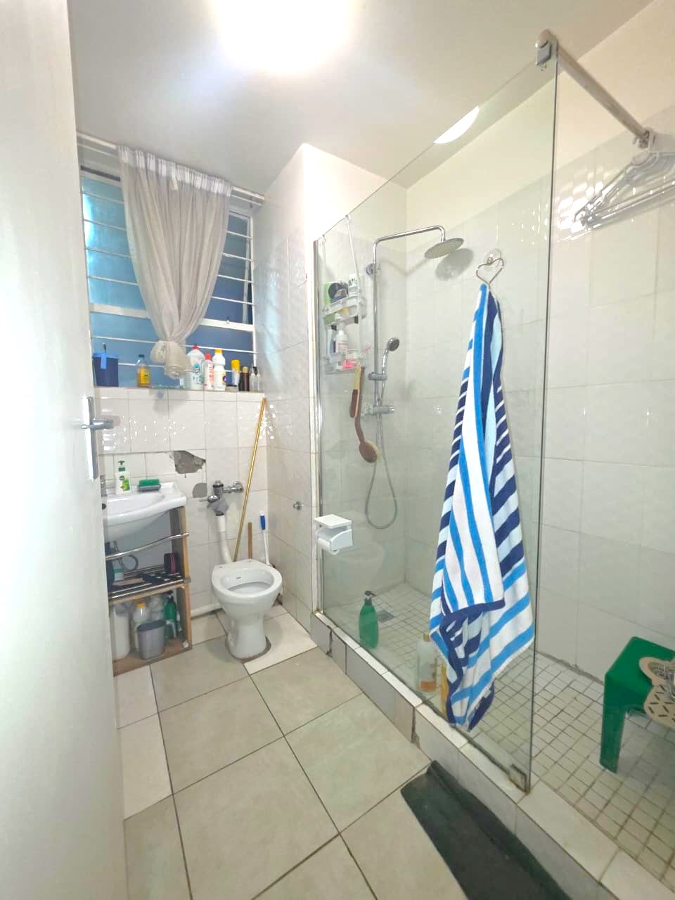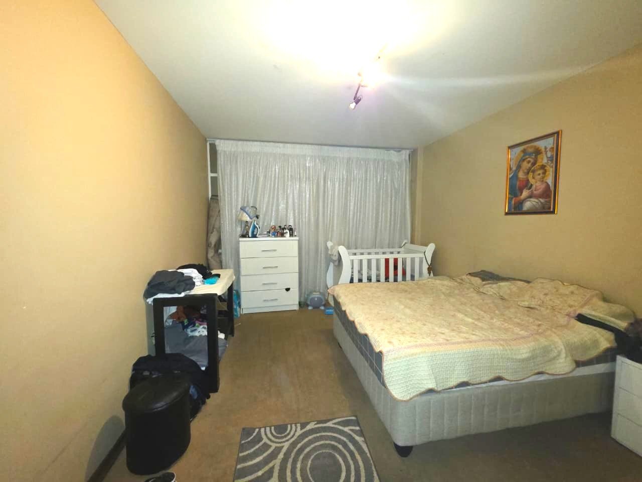 The bedroom includes built-in cupboards. The bathroom has a toilet,