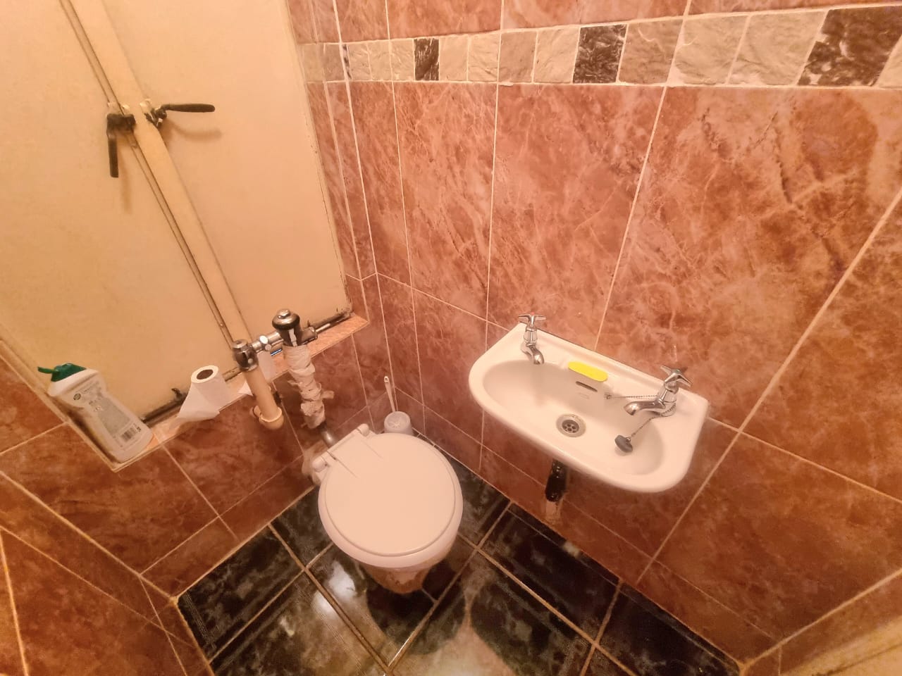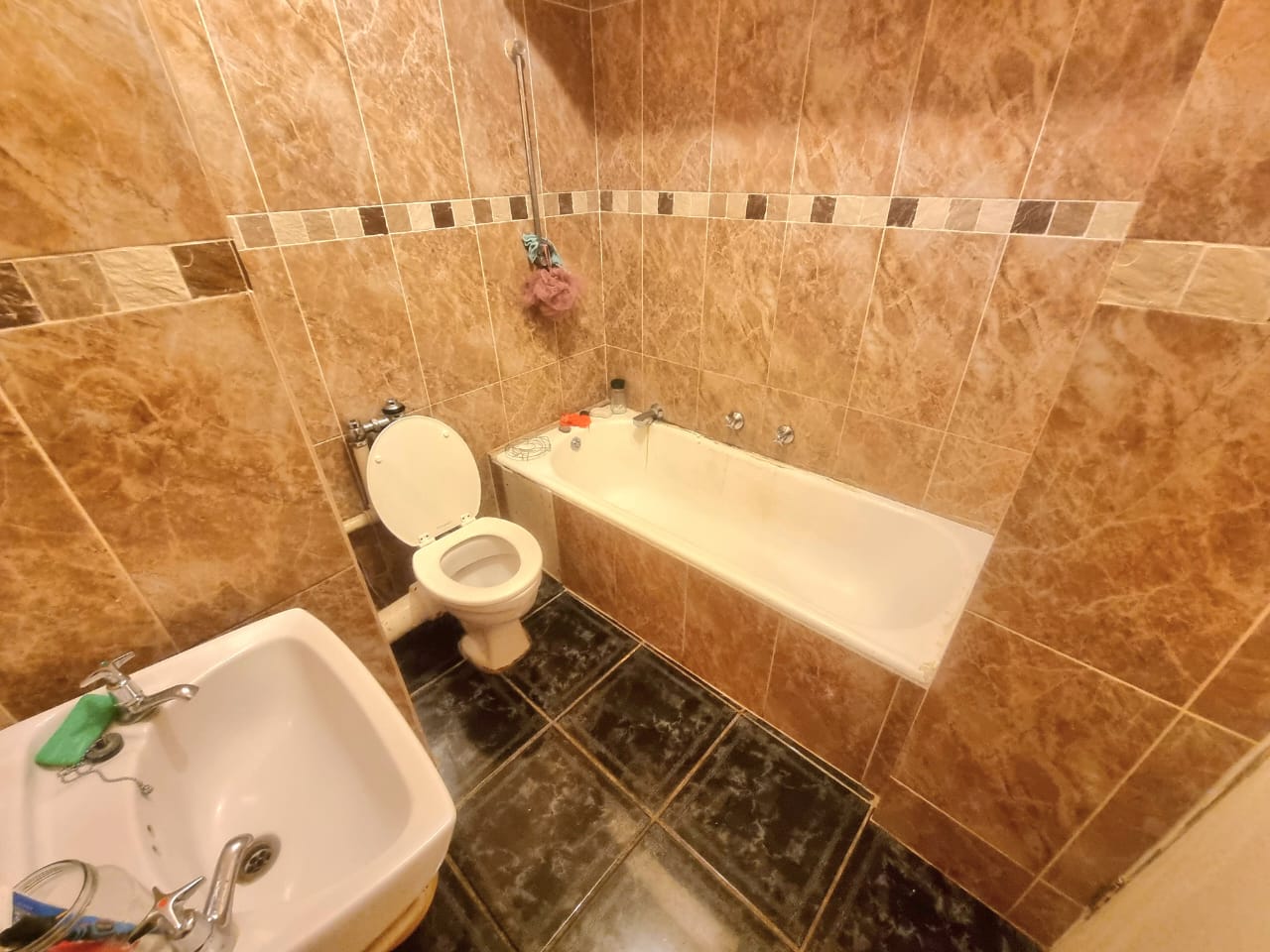 toilet with basin. The bathroom has a toilet, basin and bath.