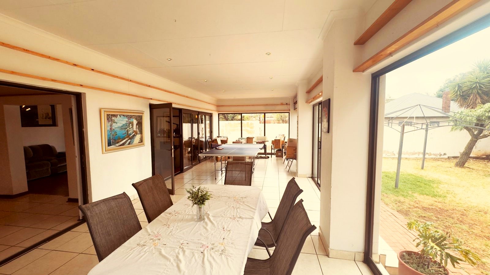 and curtain railing. The lounge opens up to a spacious, enclosed patio,