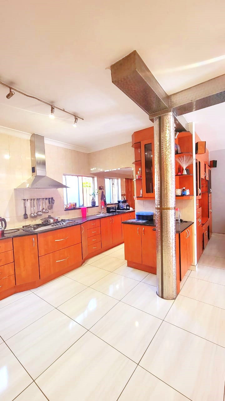 The heart of the house has a modern open plan kitchen and equipped with everything a chef could ask for. Lots of cupboards; granite top, 4 plate gas stove, double oven, scullery and spacious pantry to finish off the kitchen.