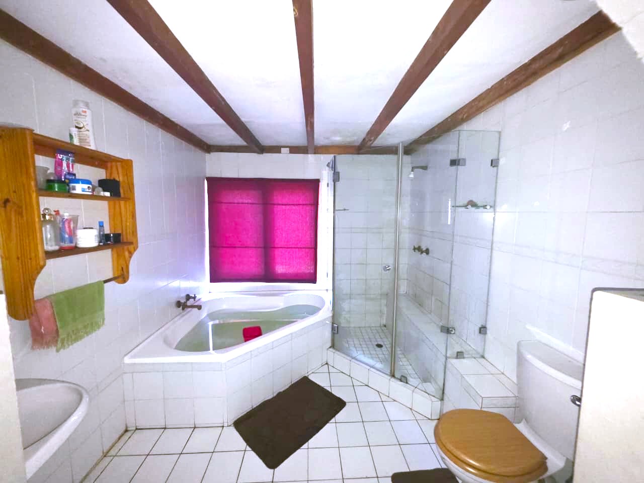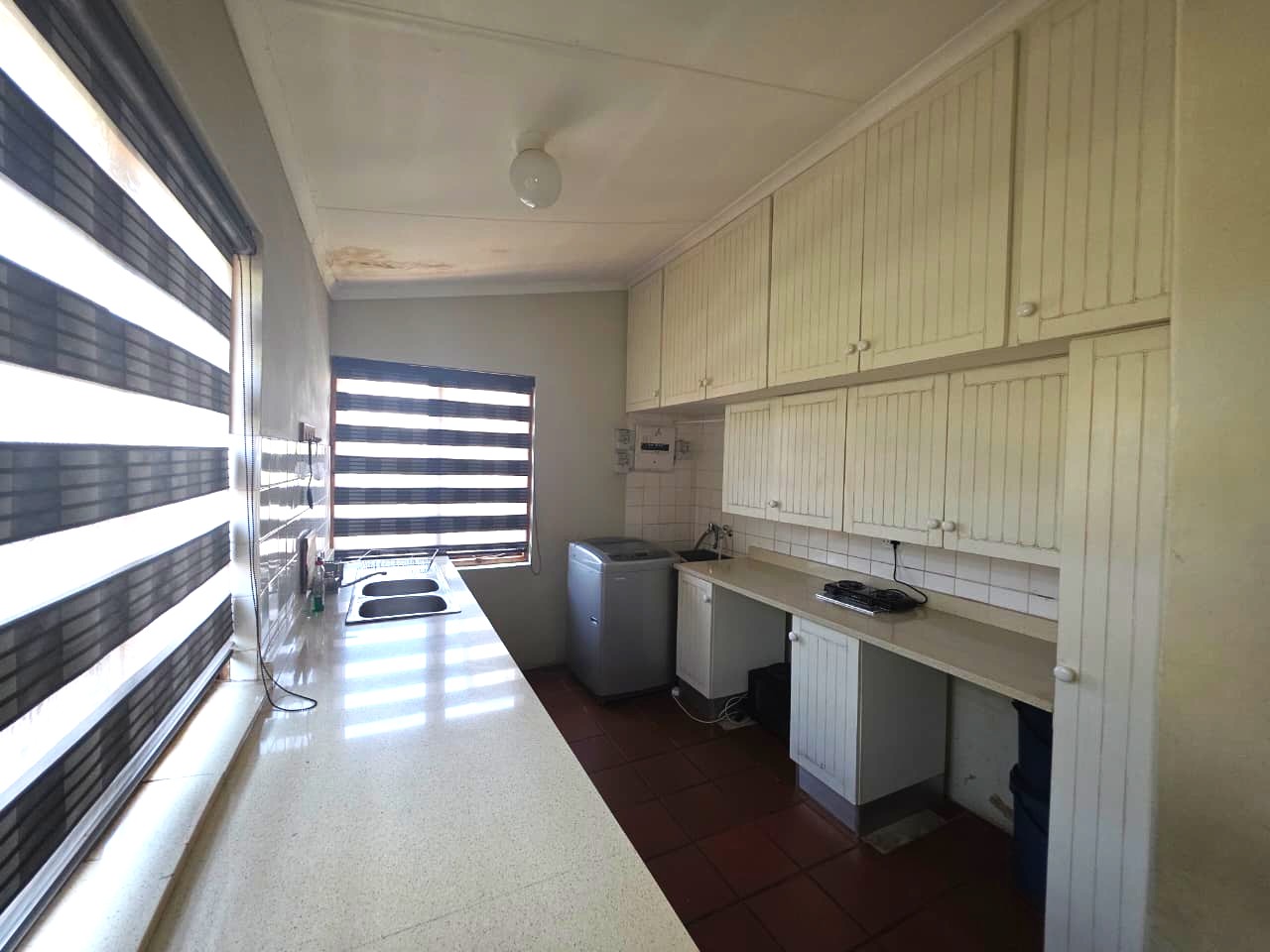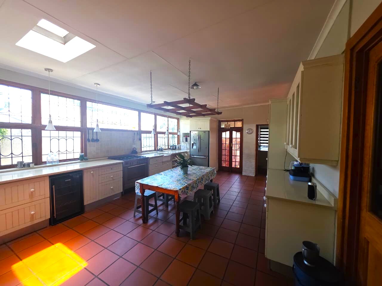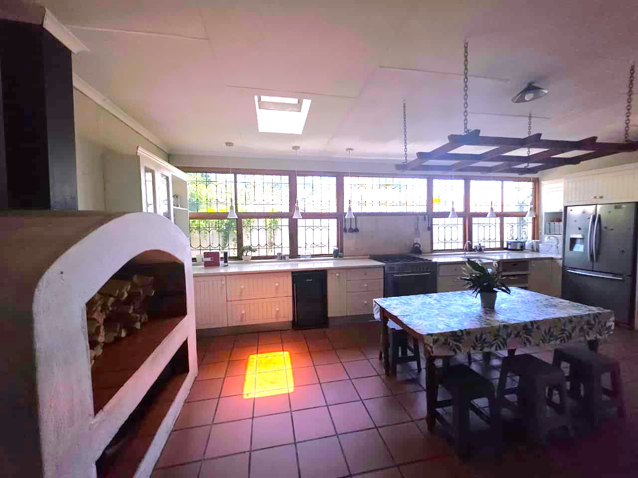 This family home offers comfort and functionality. Starting an entrance hall that leads into a spacious lounge, and a dining room with a skylight. The kitchen is one of the standout features, it is spacious and well-equipped, complete with a skylight, a gas stove, a pizza oven, a pantry, and a separate scullery for added convenience.