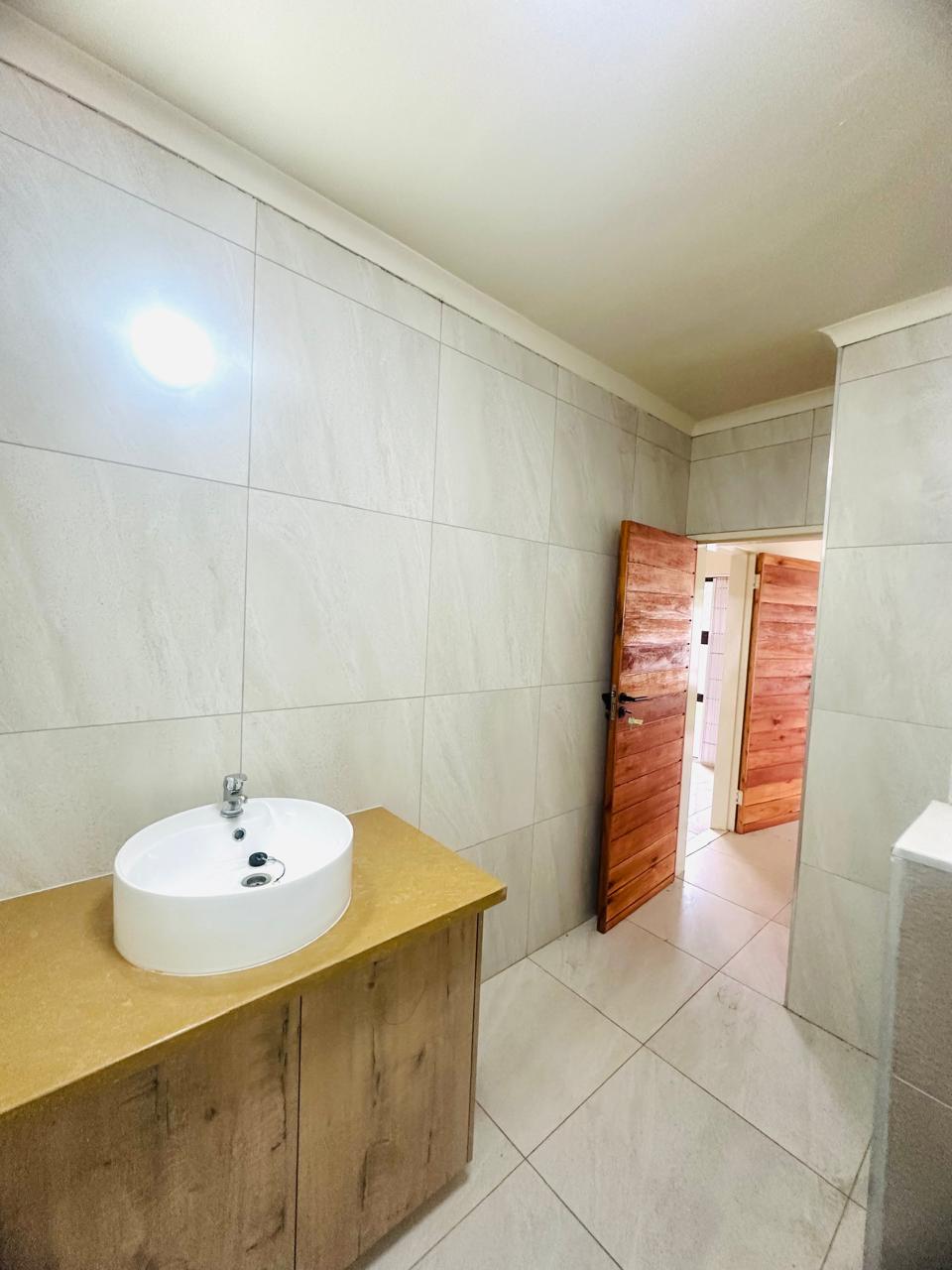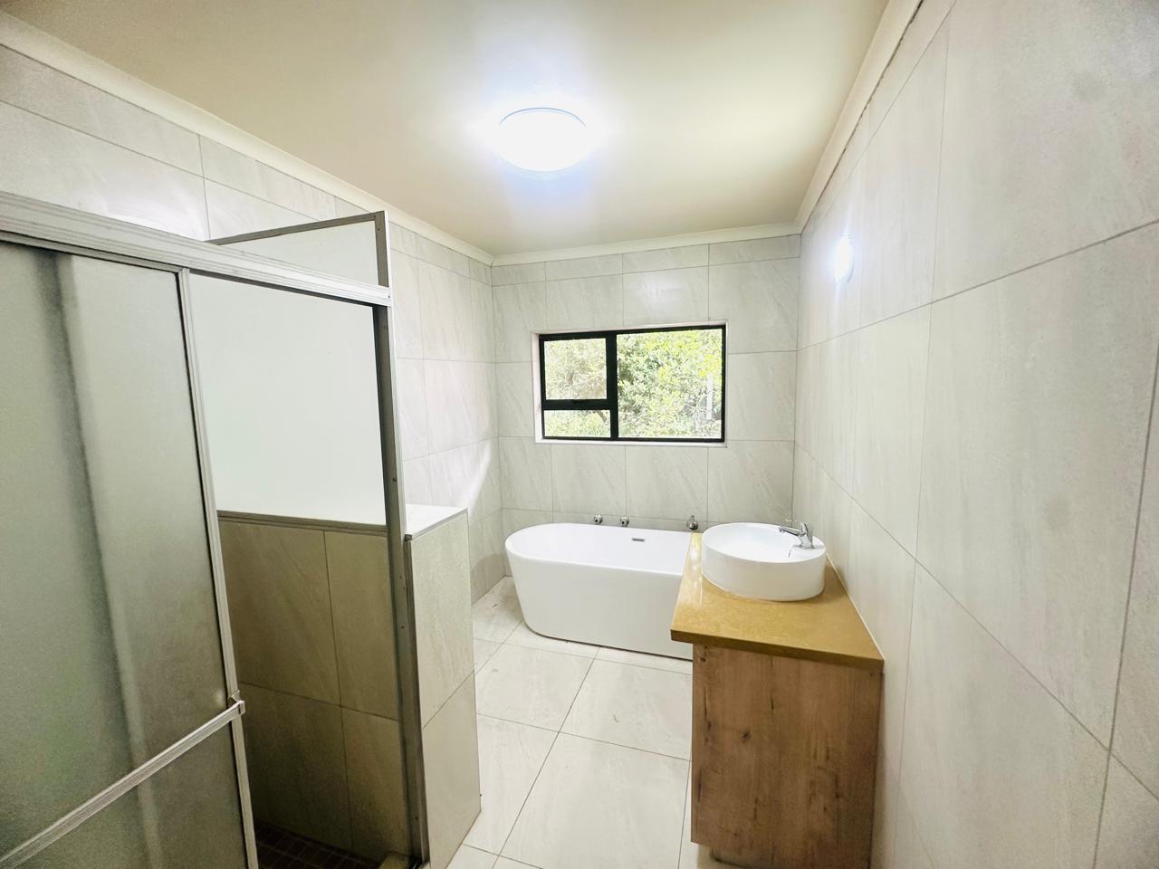 On the ground floor, this home features, a passage, lounge, kitchen with built in cupboards and dining area. There is also a guest bathroom (toilet, basin, and shower), study/office and a TV Room. A bedroom with built in cupboards and an ensuite (toilet, basin, shower and bath) is located downstairs.