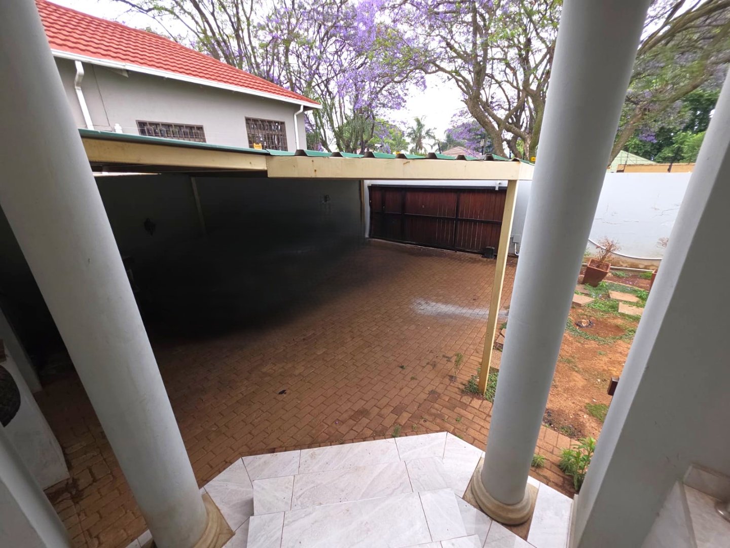 Secure parking for 2 vehicles with a carport.
