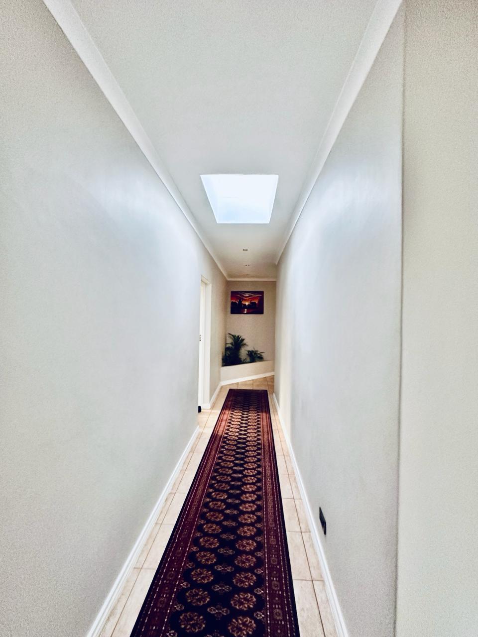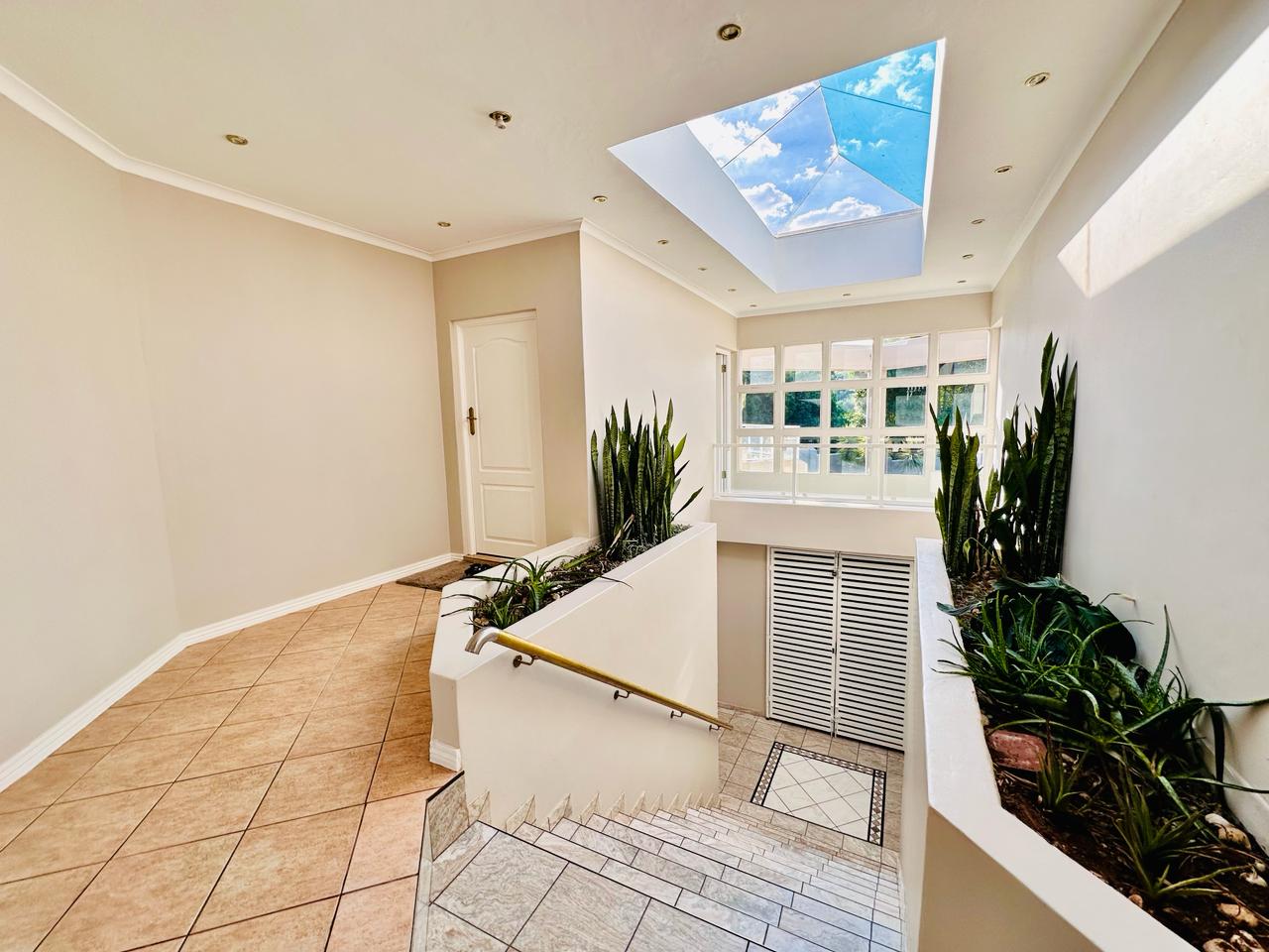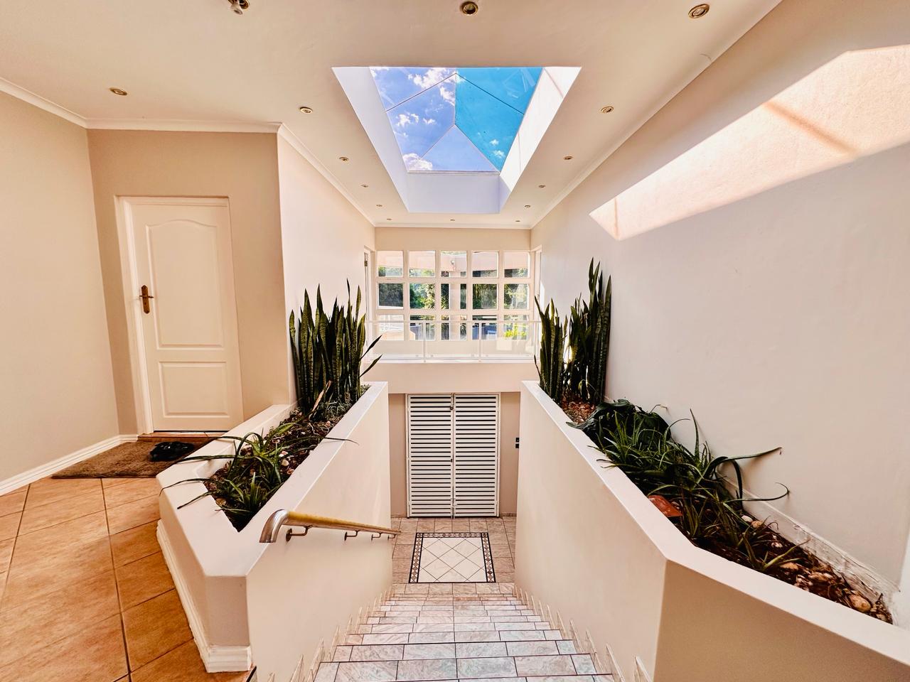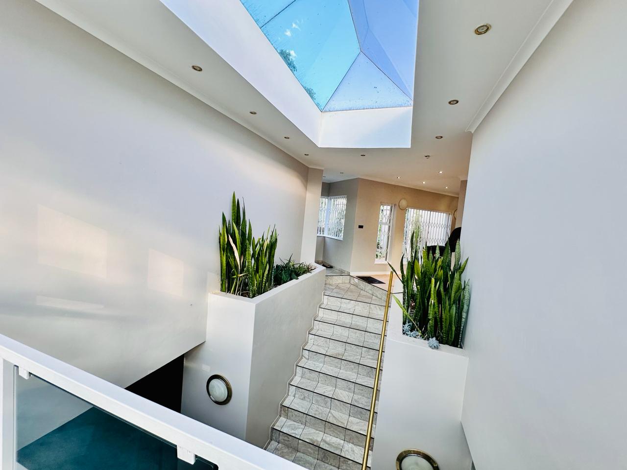 Starting off by welcoming into our entrance hallway with our built-in skylight, allowing for natural lightning to flow on into the room. There is a lounge downstairs that has a fireplace that works on gas. This area can be used for family or guests to sit down and have a conversation with. For ease and convenience there is a guest toilet as well as an office downstairs.