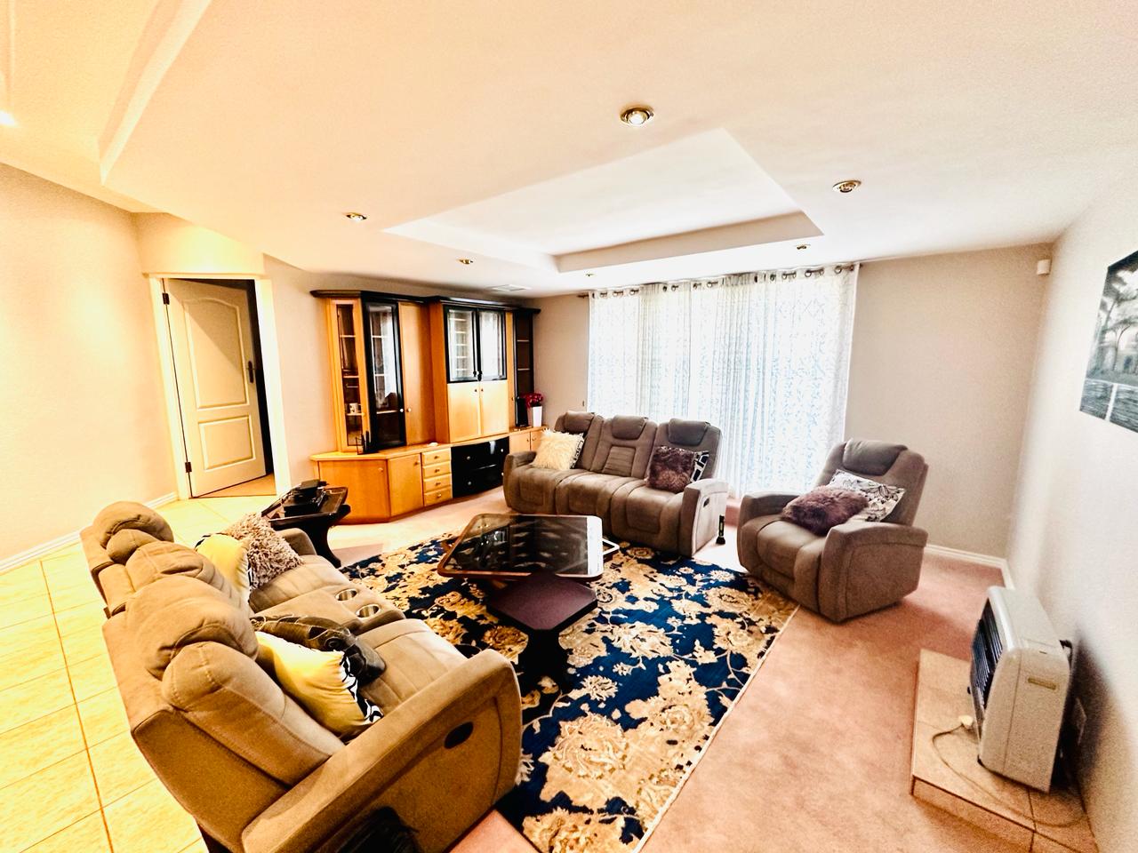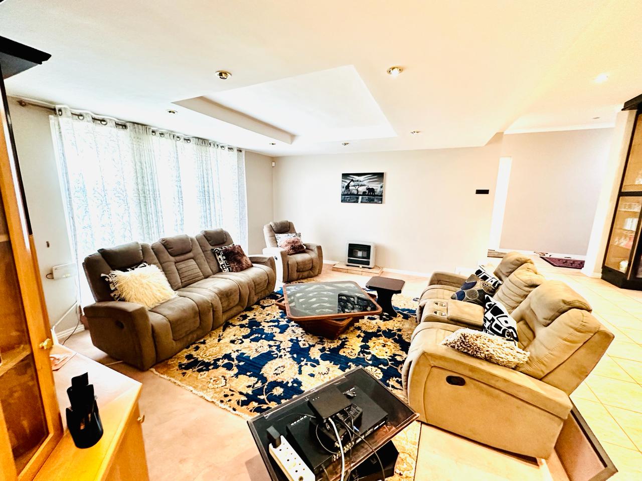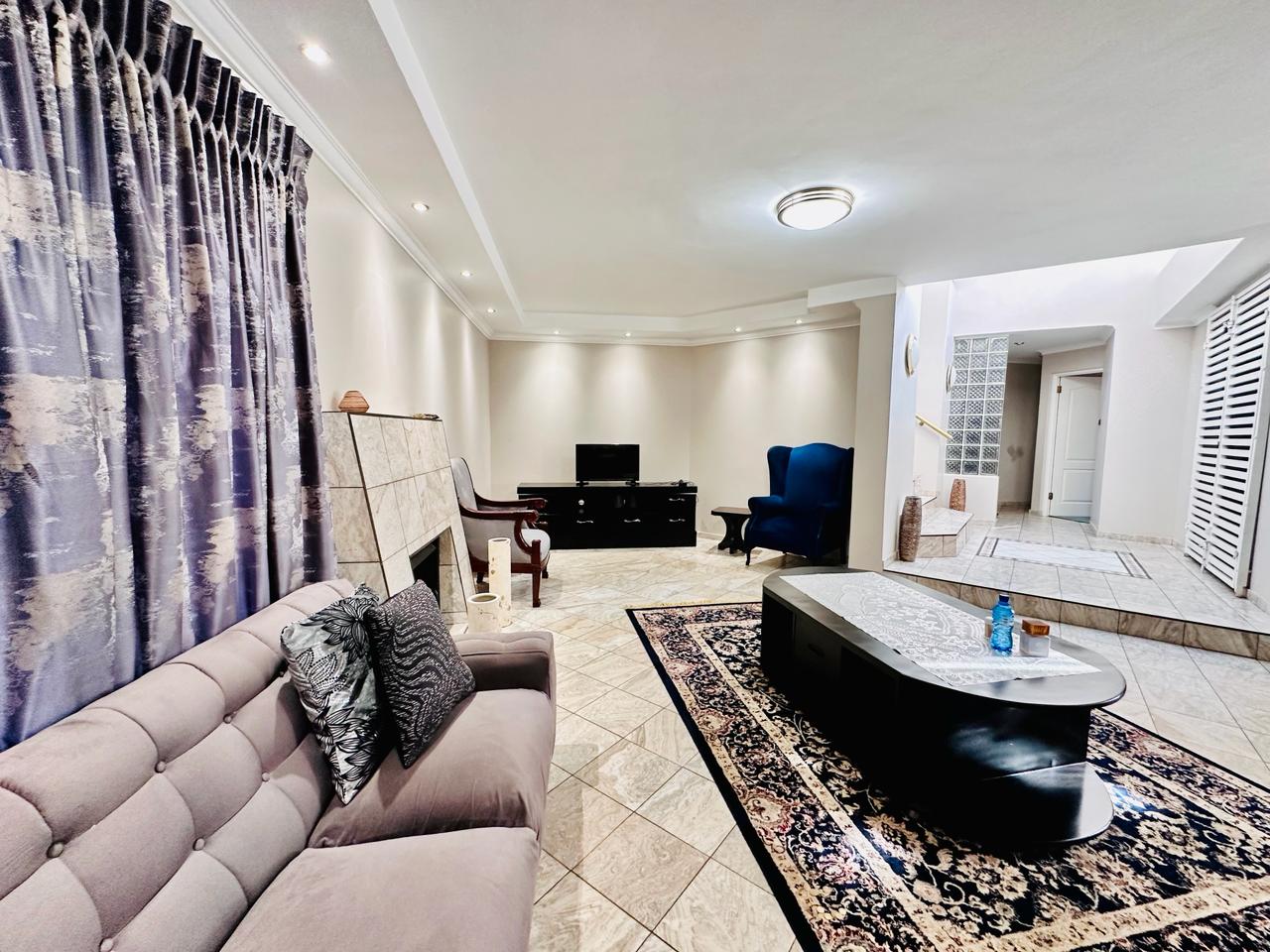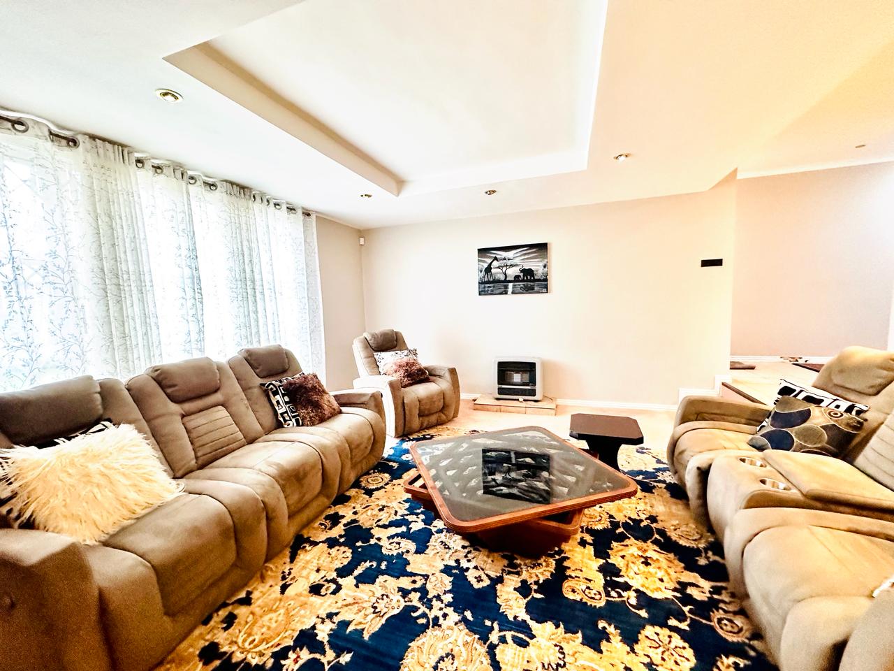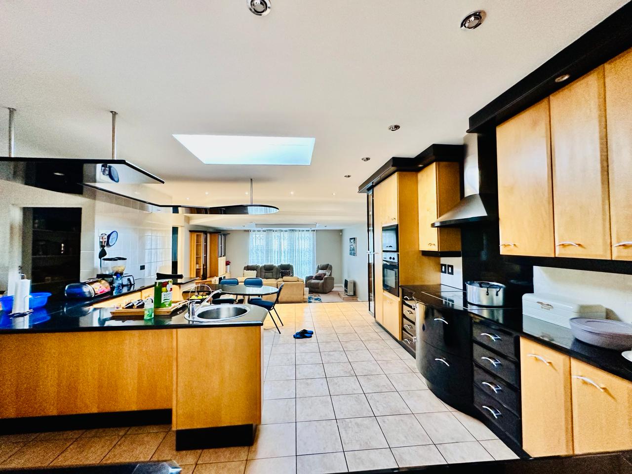 Starting off by welcoming into our entrance hallway with our built-in skylight, allowing for natural lightning to flow on into the room. There is a lounge downstairs that has a fireplace that works on gas. This area can be used for family or guests to sit down and have a conversation with. For ease and convenience there is a guest toilet as well as an office downstairs.