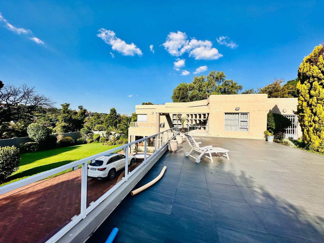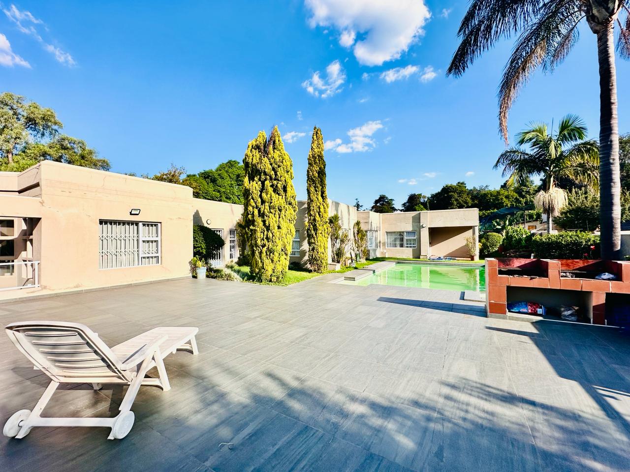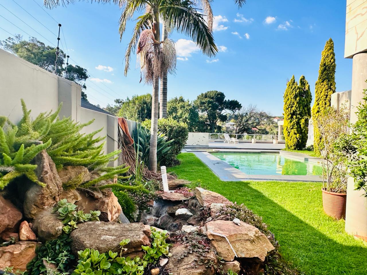 Stepping outside we find the sparking swimming pool that has an entertainment area and built in braai area, this is all situated on top of the garage. There are 2 secure lock up garages that can contain up to 4 vehicles. There is a maid’s room and a gardener’s room, these 2 rooms share a toilet and shower.