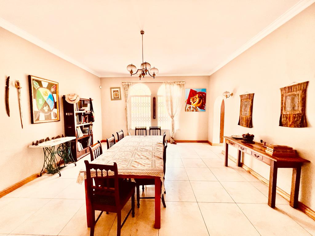 The main lounge on the lower level exudes warmth and leads to a well-appointed kitchen featuring granite countertops, a 4-plate stove, and a centre island. The spacious dining area, flowing into a study, sets the tone for a welcoming atmosphere. With two lounges, 1 downstairs, pyjama lounge upstairs, this home offers versatile living spaces.
